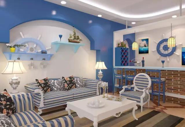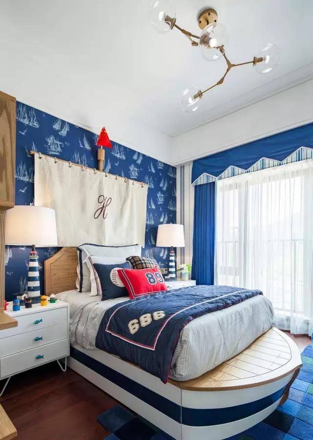 大面積的使用藍色,搭配藍色的軟裝,海洋元素很豐富。