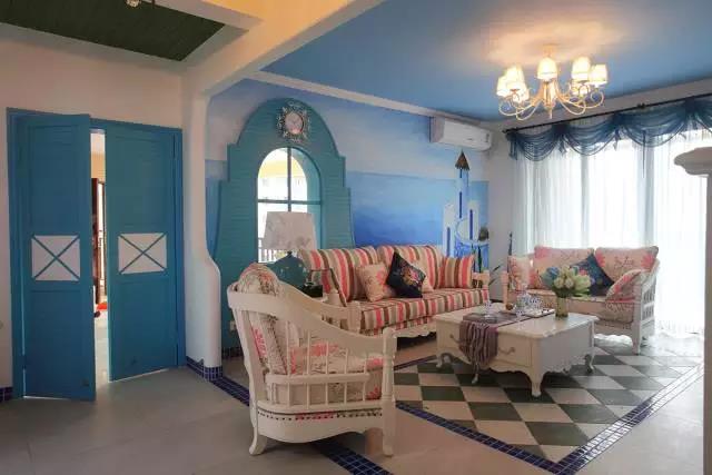 以馬賽克裝飾會客區(qū)的地面,除了沙發(fā)背景墻元素有點多,白色紗簾藍色簾頭倒是很出彩。