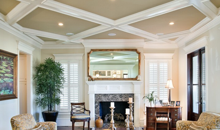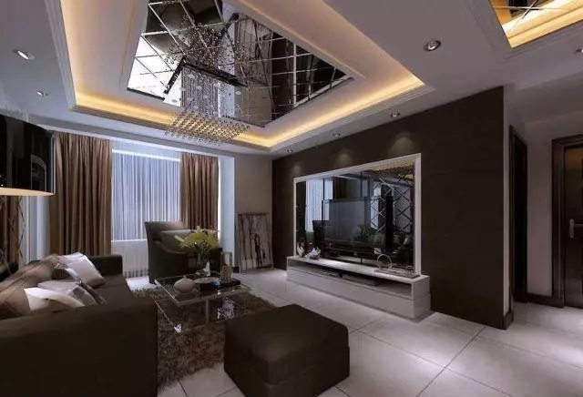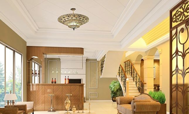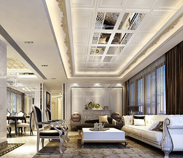 井格式吊頂是利用井字梁因形利導或為了頂面的造型所制作的假格梁的一種吊頂形式。配合燈具以及單層或多種裝飾線條進行裝飾,豐富天花的造型或?qū)邮疫M行合理分區(qū)。