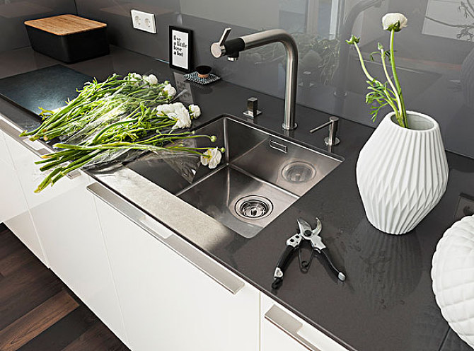 石英石也是目前漸漸流行起來的材質,不怕高溫、不怕染色,跟同樣常見的石英石臺面還能一體化搭配,做到無縫銜接。但缺點就是質地沒有不銹鋼材質堅硬,整天接觸金屬廚具容易擦蹭。除了石英石還有花崗石等,但是天然石材比較昂貴,動輒10000+……
