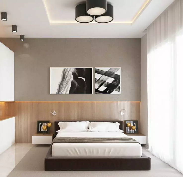 臥室如果高度不夠,不建議設(shè)計吊頂,因為會給人一種累贅感,但是如果高度適宜,可以打造一個比較簡易的吊頂,這就要求吊頂每個設(shè)計面板的接縫一定要嚴密。