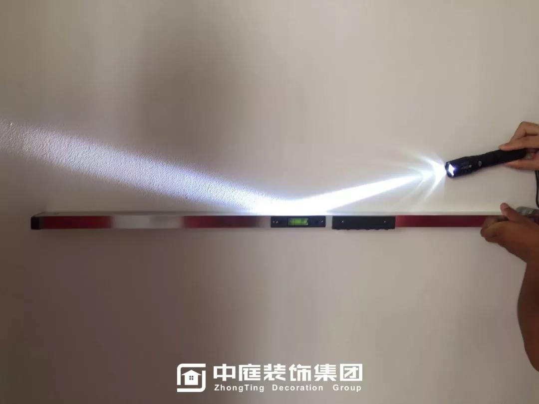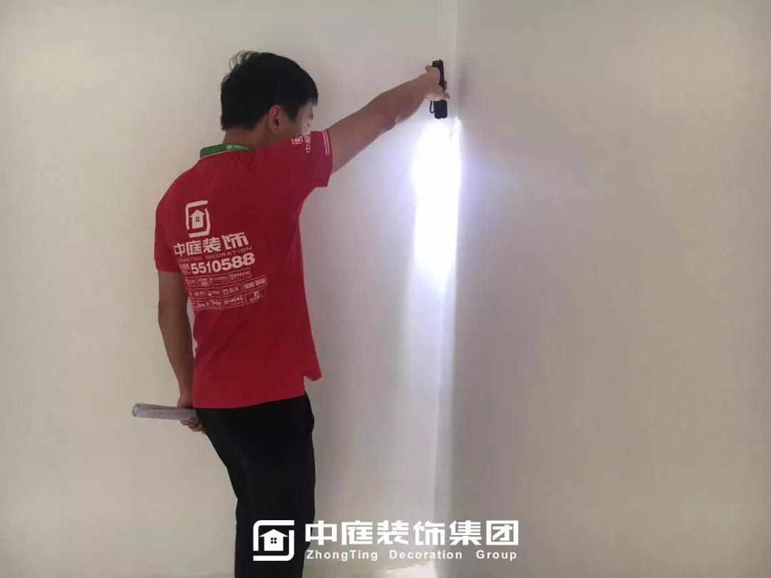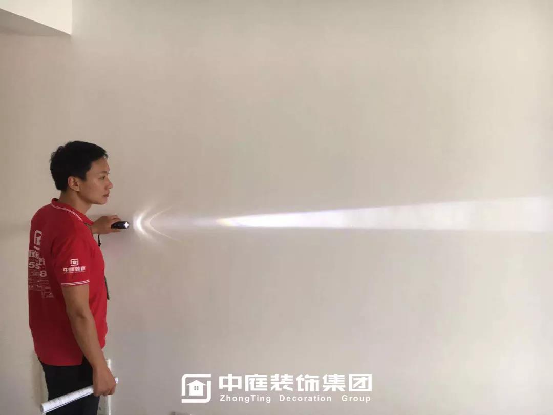 ▲檢查墻體膩?zhàn)邮欠衿秸饣?/span>