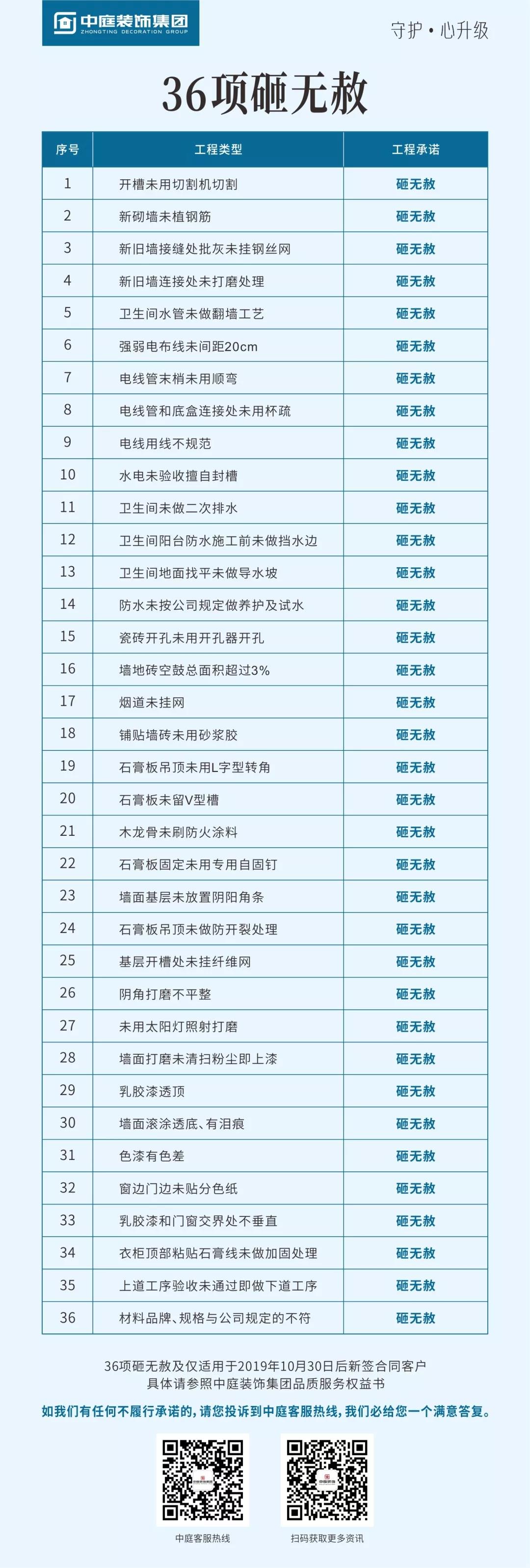 集團(tuán)率先在廣西在家裝行業(yè)提出20項(xiàng)客戶最為關(guān)注的終身保修,以及36項(xiàng)砸無赦項(xiàng)目承諾,對(duì)于不達(dá)標(biāo)的施工施行“零容忍”,以更嚴(yán)格的施工標(biāo)準(zhǔn)為品質(zhì)家保駕護(hù)航。