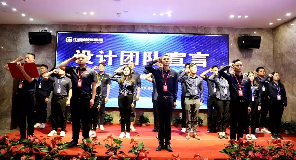 ▲中庭裝飾副總經(jīng)理鄒恒元帶領(lǐng)設(shè)計(jì)團(tuán)隊(duì)管理人員簽署設(shè)計(jì)服務(wù)承諾書