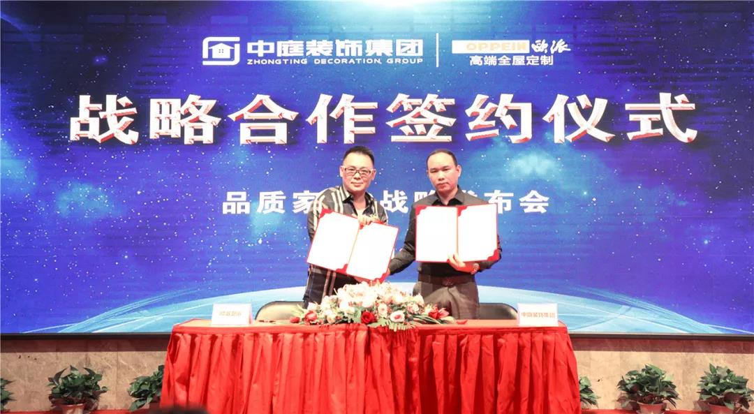 ▲集團(tuán)副總裁吳文戰(zhàn)與歐派潔具總經(jīng)理曾濤簽署戰(zhàn)略合作協(xié)議
