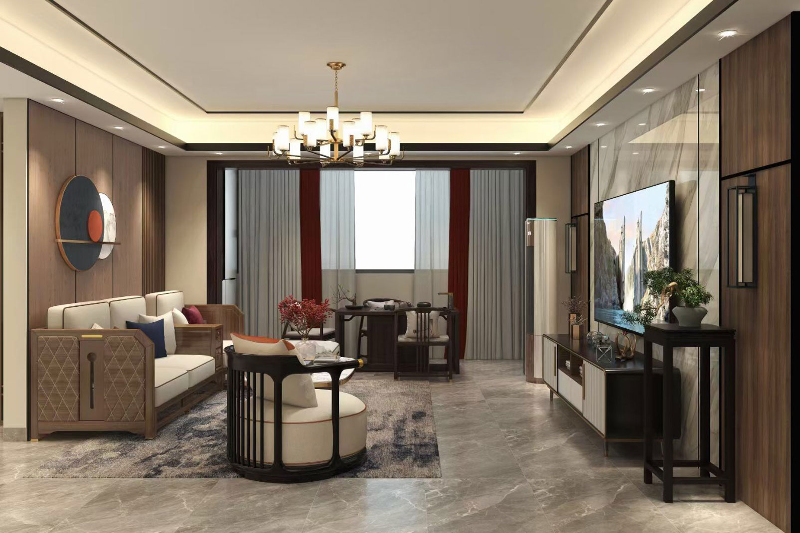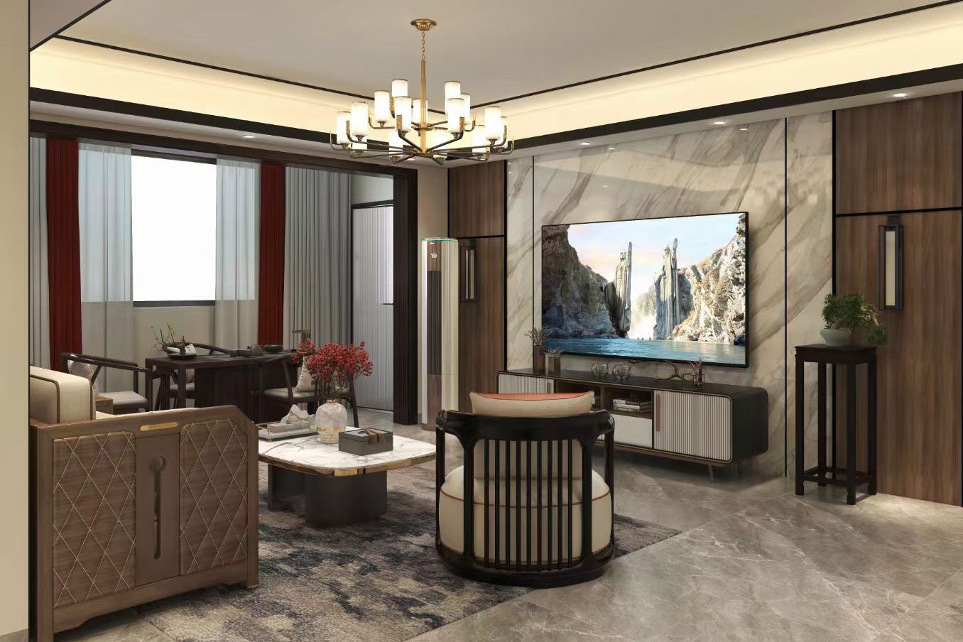 瀏覽量:436天立TT國際258㎡案例,戶型為:四房兩廳兩衛(wèi),屬于新中式風(fēng)格。整體家具陳設(shè)講究對稱,重視文化意蘊(yùn),整體以深色為主,以古香古色的中式擺件、掛畫來點(diǎn)綴空間,在一些細(xì)節(jié)上勾勒出禪宗的意境。但同時會使用現(xiàn)代時尚元素,比如附帶金屬邊框的桌椅、花瓶,以及背景掛飾等,使整體的家居設(shè)計中既有中式家居的傳統(tǒng)韻味,又有現(xiàn)代家居的時尚大氣。