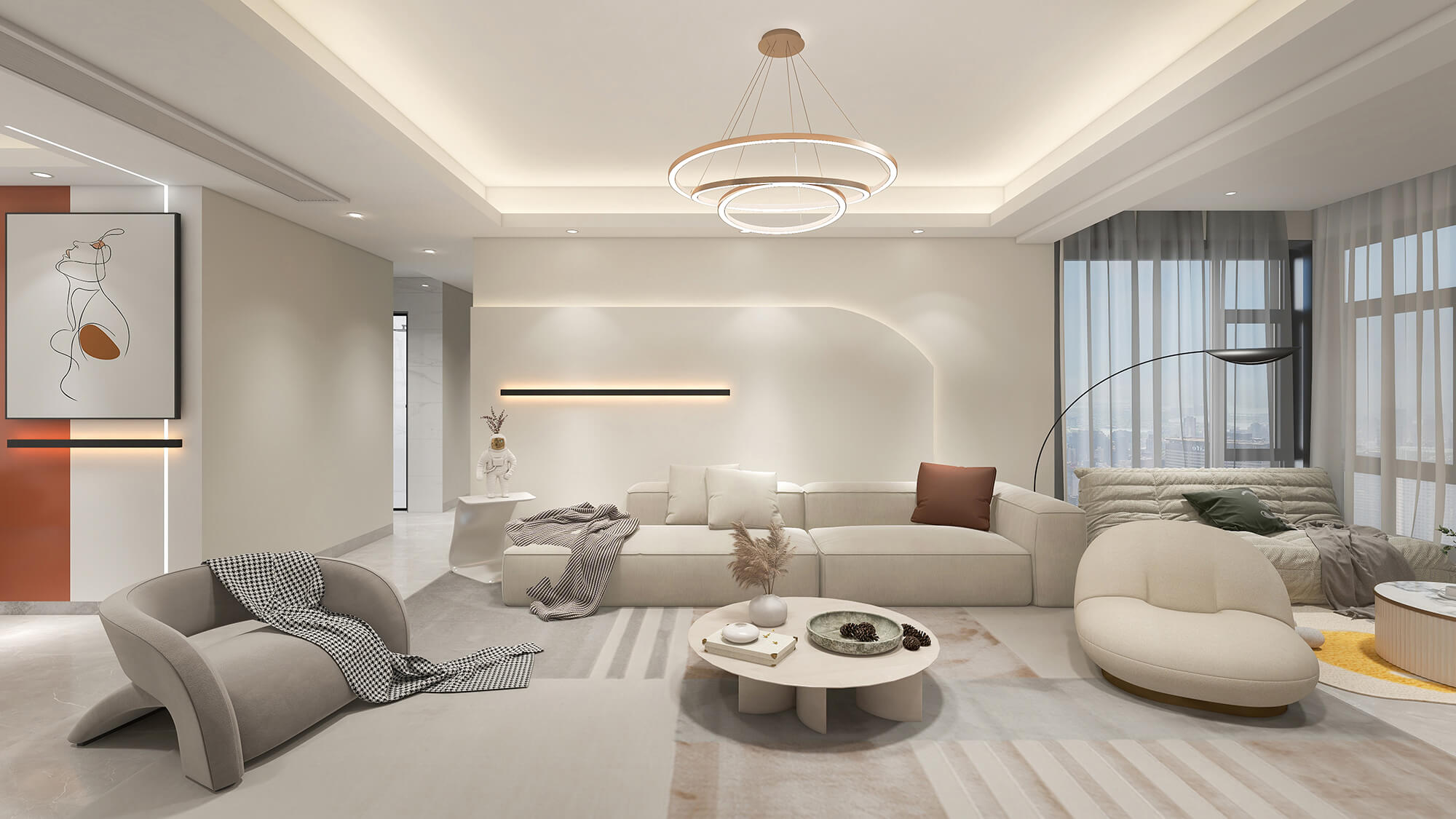 本案例戶型為:4房2廳3衛(wèi),總面積100㎡。極簡的設(shè)計(jì)構(gòu)思,帶來身心的極大釋放,繁華喧鬧的城市仿佛被隔絕在外,寧靜的氛圍讓人放下心理的防線,更加自由自在。