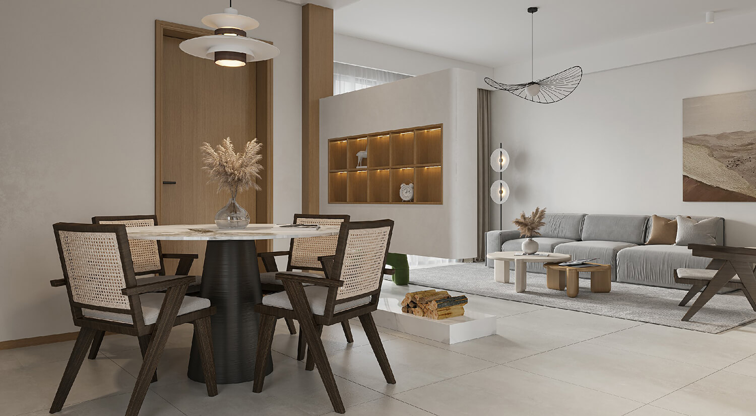 本案屬于現(xiàn)代簡約風(fēng)格??蛷d采用無主燈設(shè)計(jì),更具簡約時尚感??筒蛷d布局合理,客餐廳通鋪淺灰色瓷磚。使空間更加開闊明亮,增加空間美觀度。