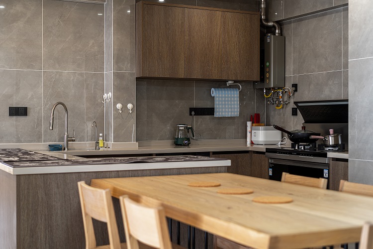 3.廚房:開放式廚房與客廳互為連通又相對獨(dú)立,中西廚合并與島臺的設(shè)計(jì)滿足烹飪需求。