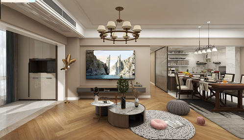 整個空間基于原宿風(fēng)格上做搭配,客餐廳地面采用兩種材質(zhì),充分把功能性能提高;